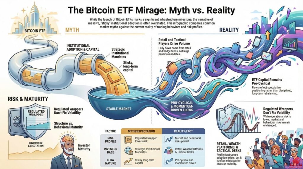 Fact: Infrastructure adoption is real. But the persistent myth around institutional adoption in the Bitcoin ETF market shows how easily structure can be mistaken for behavioral maturity.