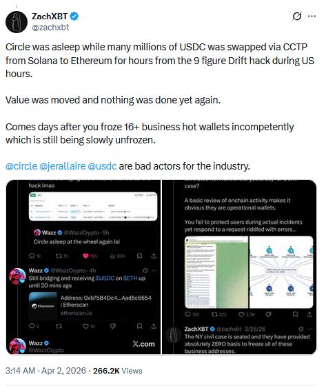 The Drift Protocol hack has also widened into a second debate about how crypto infrastructure firms respond once stolen funds begin moving across chains. Blockchain investigator ZachXBT criticized Circle, arguing that millions in USDC moved from Solana to Ethereum for hours without intervention.