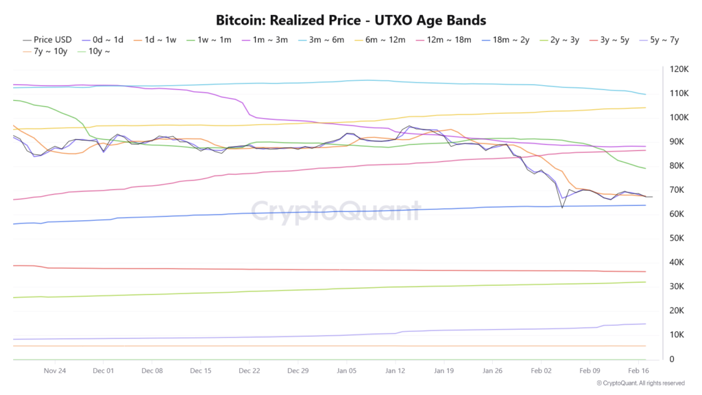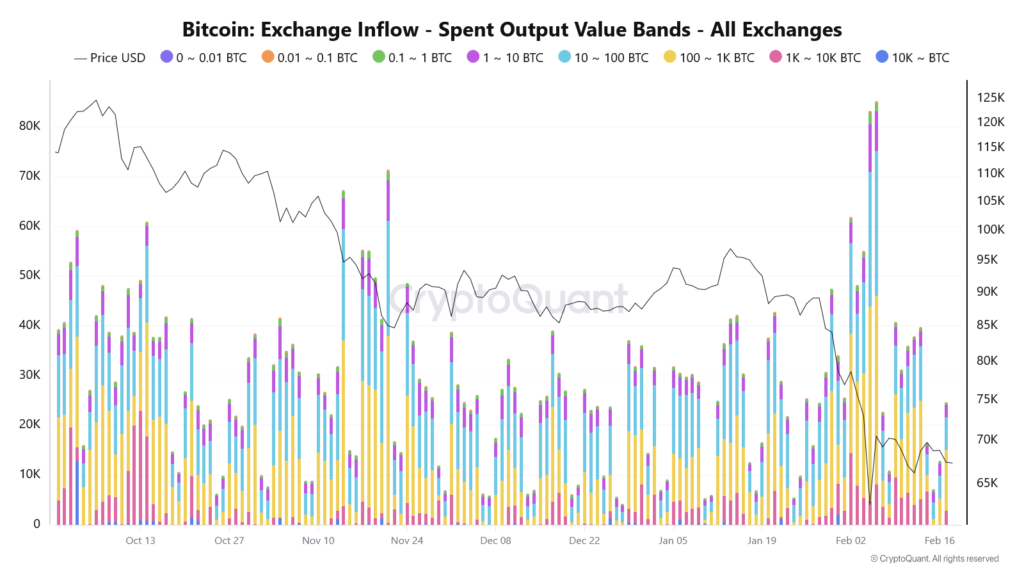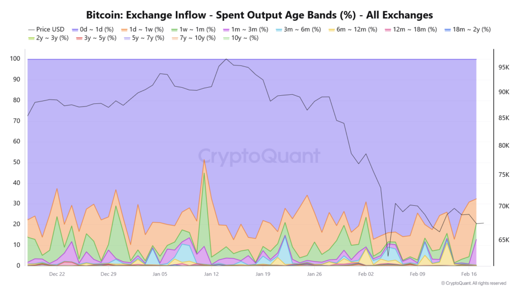 Bitcoin exchange inflows from mid-term holders have increased in recent sessions. Inflows have accelerated specifically from the 3–6-month (light blue) and 6–12-month (yellow) age bands in January through mid-February.