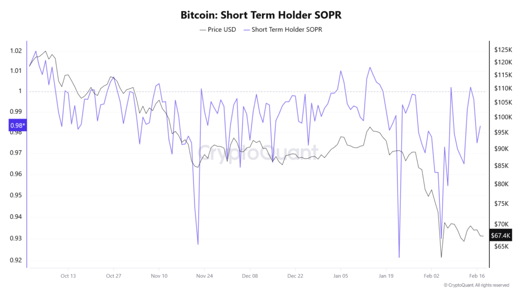 CryptoQuant STH SOPR chart, Oct 2025–Feb 18
