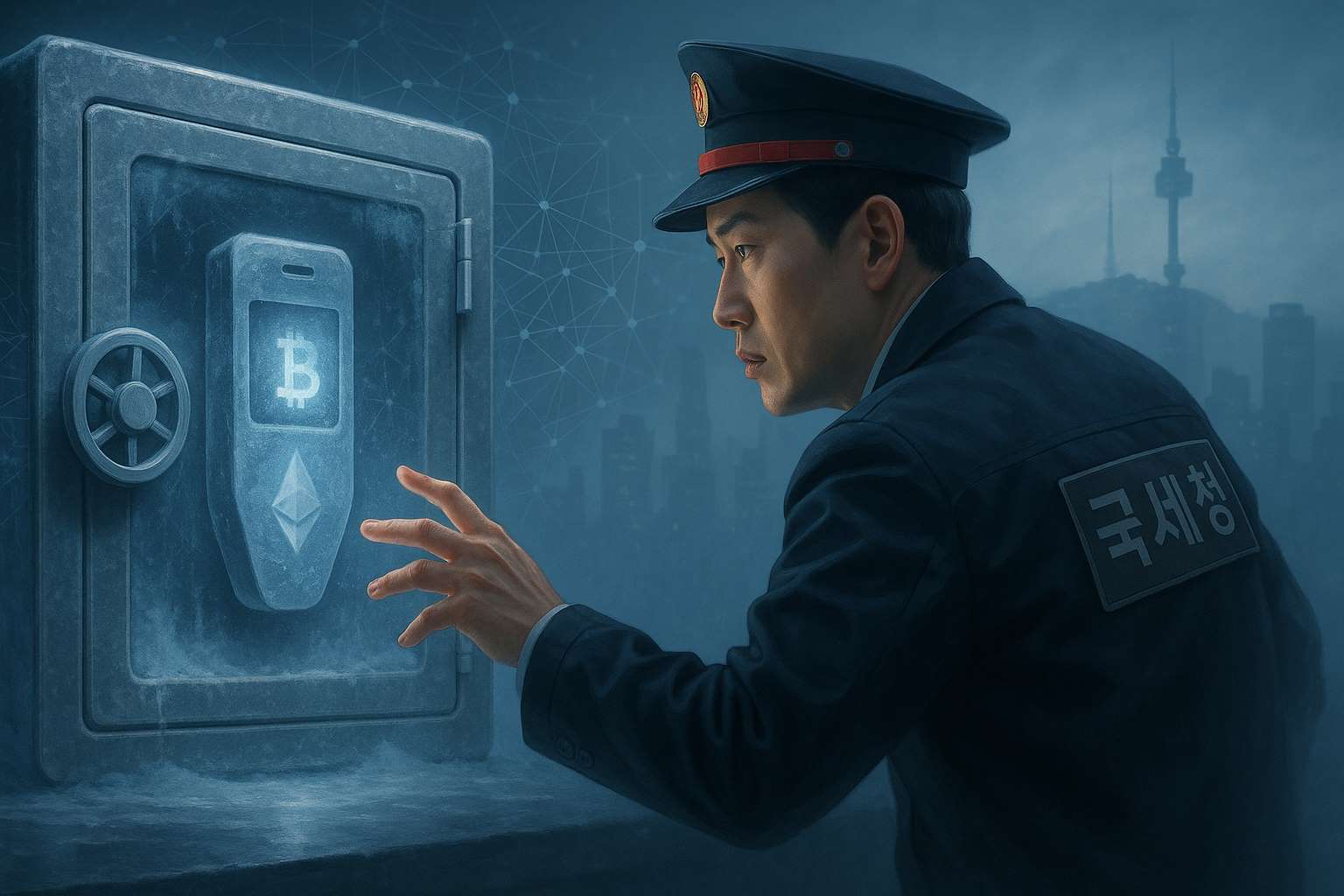 South Korean tax inspector reaching toward a glowing hardware crypto wallet locked in an icy digital safe, symbolizing the South Korea crypto tax crackdown and cold wallet seizure enforcement.
