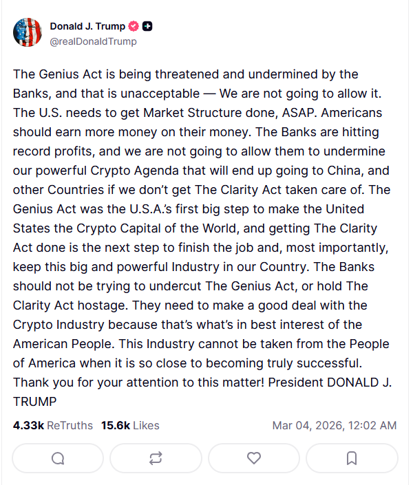Reports indicate the president met privately with Coinbase CEO Brian Armstrong before posting comments accusing banks of attempting to undermine his administration’s crypto agenda. Trump called on lawmakers to pass the legislation quickly, framing the issue as part of a broader effort to modernize the U.S. financial system.