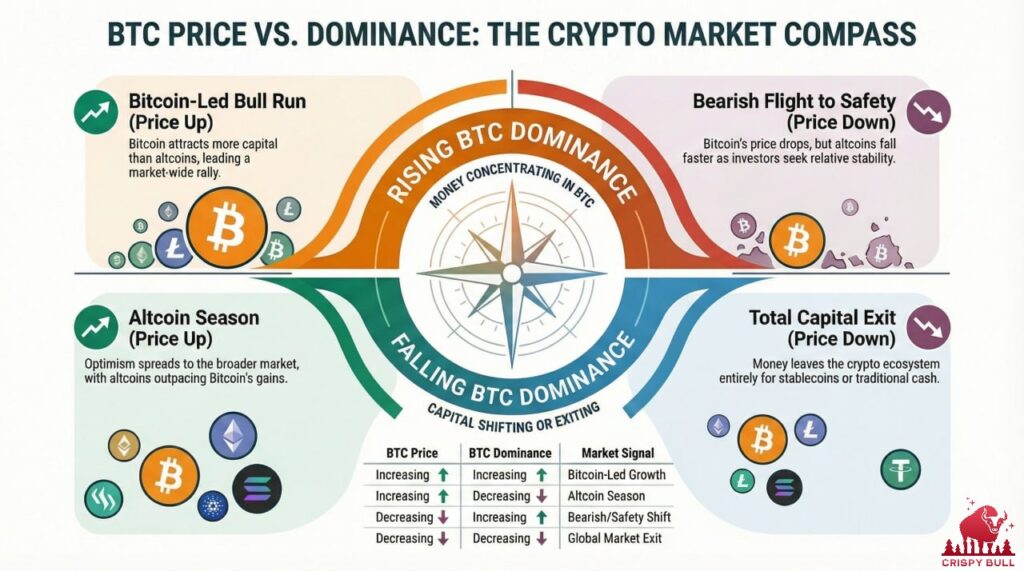 In summary, Bitcoin dominance increases when Bitcoin is seen as the most attractive or safest investment in crypto. It decreases when investors chase growth across the broader altcoin landscape. It remains one of the most widely watched metrics to gauge where money is flowing in the digital asset market.